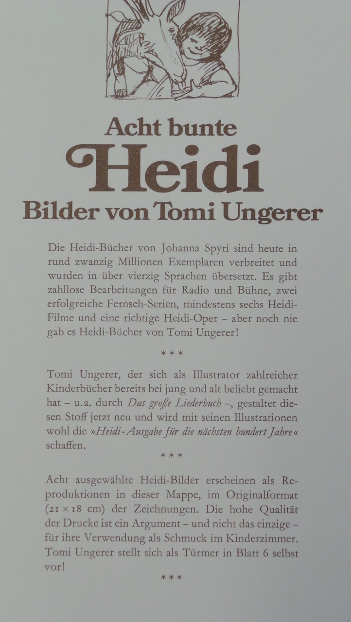 Die ausgewählten Heidi-Bilder sind 1978 als Reproduktionen in einer Mappe erschienen, im Originalformat (21X18 cm) der Zeichnungen.